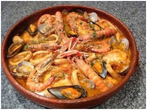La zarzuela est servie en cocotte de cuisson avec croûtons frits à l’huile d’olive. Elle peut être relevée avec de l’absinthe.