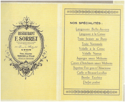 Spécialités : gratin d’écrevisses, poulet grillé, champignons des gourmets, truite au Chambertin, poularde de Bresse Brillat-Savarin, foie gras en croûte, gratin dauphinois..
