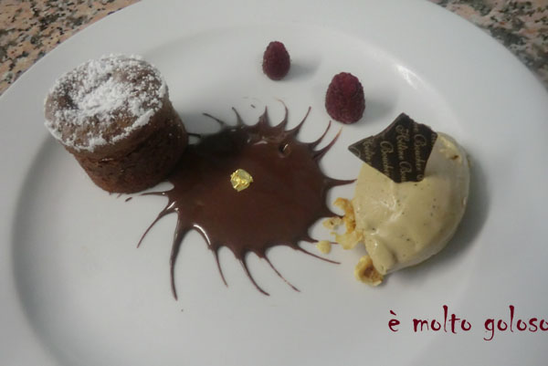 - – Dresser sur assiettes froides : fond d’assiette avec sauce chocolat. 1 mi-cuit chaud ou tiède, 1 quenelle de glace café sur noix de pécan caramélisées concassées.
