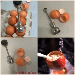 Après avoir toqué votre œuf, vider l’œuf pour une utilisation ultérieur. Bien laver la coquille. Sécher. Garnir de préparations froides ou chaudes, salés ou sucrées. La coquille peut être passer à l’aérographe pour une plus belle présentation (froide).