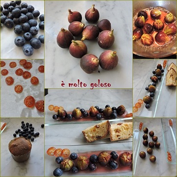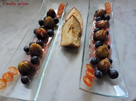 - ◊ Dresser sur assiettes transparents longues : 5 figues pochées, myrtilles, kumquat. Finir avec sirop sur les figues. Panettone à part pour saucer.