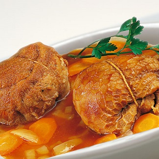 Le cuisson est effectuée durant plusieurs heures dans un fond de veau au vin blanc avec carottes, oignons et tomates.