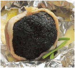 Truffes noires du Périgord (Tuber mélanosporum) brossées et lavées, les graisser légèrement à la graisse de canard ou d’oie, assaisonnées enveloppées d’une tranche de lard.