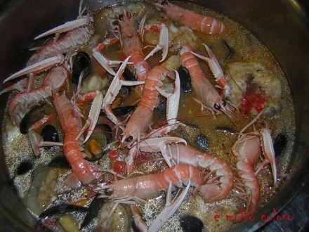 - * Assaisonner et fariner légèrement les morceaux de poissons. Les faire dorer à l’huile d’olive. Ajouter les tomates, l’ail et le piment d’Espelette. Ajouter le fumet de poissons au vin blanc et le jus de moules bouillants. Cuire rapidement. Ajouter les langoustines en fin de cuisson.