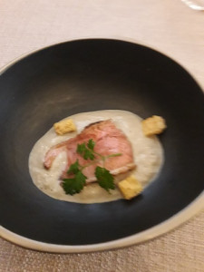 Cake carotte saumon fumé maison – Velouté de champignons filet de canette croûtons