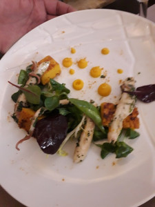 Poulpe de roche en vinaigrette, cake carotte/curcuma
