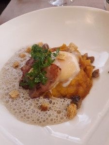Œuf de poule cuit mollet sur une compotée de courge épicée, fine tranche de lard fumé, écume de châtaigne