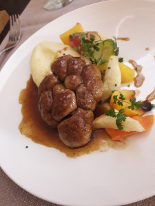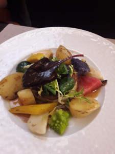 Rognon de veau sauté rosé, fine purée et légumes croquants