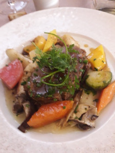 Paleron de veau confit, champignons et légumes fondants, consommé au goût des sous-bois