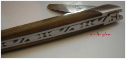 Le bois de Gaïac est un bois brun verdâtre, très dur et très dense, aussi appelé « bois saint » ou « bois de vie« , originaire pour le couteau présenté de Bolivie.