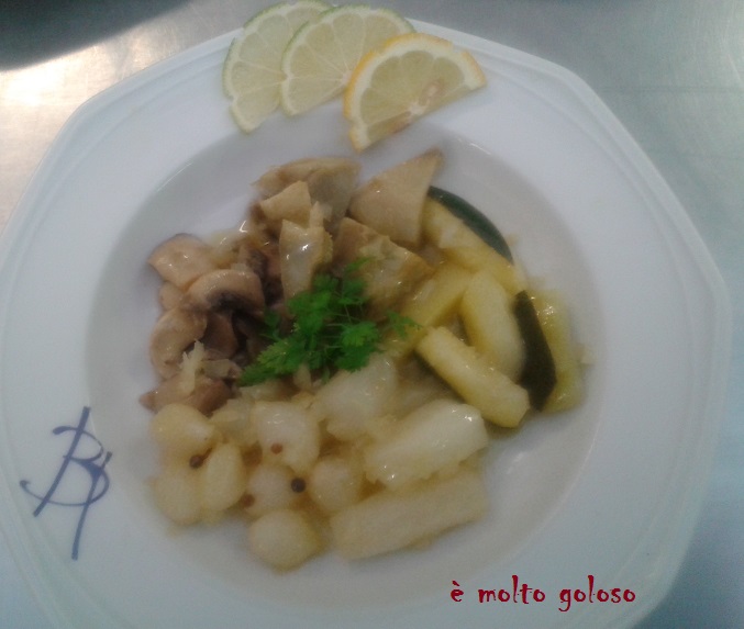 - ♦ Réaliser 5 cuissons séparées pour les différents légumes : suer l’oignon ciselé à l’huile d’olive. Déglacer vin blanc sec et jus de citron. Ajouter le légume, le sachet aromatique, du sel et quelques grains de poivre et de coriandre. Pour l’artichaut, le chou-fleur et les petits oignons ajouter un peu d’eau. Cuire (légumes croquants).