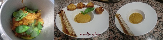 - ♦ Dresser sur assiettes creuses chaudes : coulis au centre, beignets sur l’aile de l’assiette. Finir avec vinaigre balsamique au pinceau, pétale de tomate confite et feuille de basilic.