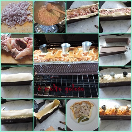 - ◊ Chemiser le moule à pâté croûte : abaisser 1 carré de 30 cm X 30 cm, 1 rectangle de 33 cm X 10 cm et 2 rectangles de 13 cm X 10 cm. Placer soigneusement le grand carré dans la longueur, ajouter les 2 rectangles sur les 2 côtés en soudant bien avec la longueur.