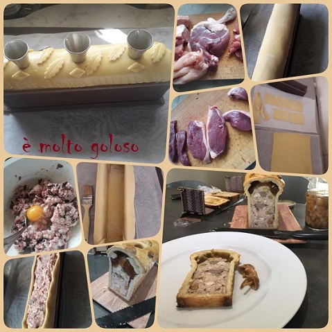 - ♦ Chemiser le moule à pâté croûte : abaisser 1 carré de 30 cm X 30 cm, 1 rectangle de 33 cm X 10 cm et 2 rectangles de 13 cm X 10 cm. Placer soigneusement le grand carré dans la longueur, ajouter les 2 rectangles sur les 2 côtés en soudant bien avec la longueur.
