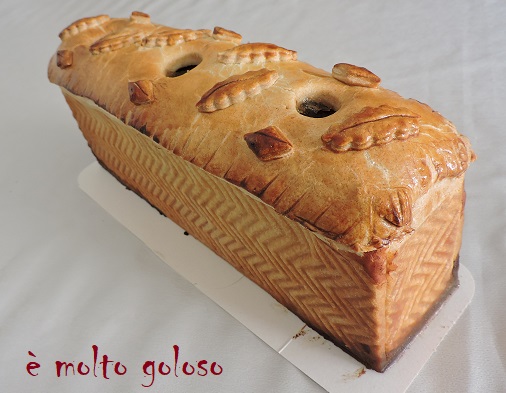- ♦ Finition : ajouter le couvercle de pâte (33 X 10), bien souder avec les doigts. Chiqueter le tour avec les doigts ou un couteau. Percer 3 cheminées et placer 3 douilles unies. Dorer le couvercle et ajouter un décor de pâte au choix. Dorer. Laisser reposer 20 minutes au frais.