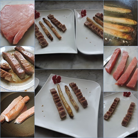 - ♦ Saisir rapidement les bandes de thon à l’huile d’olive sur toutes les faces (cuisson très rosée). Plonger le thon dans de l’eau glacée pour stopper la cuisson. Éponger sur papier absorbant.