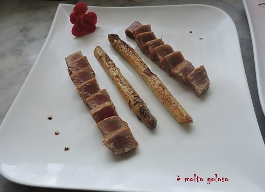 - ♦ Couper 500 grammes de thon albacore en bandes de 3 cm de section. Assaisonner sel fin et poivre timur du Népal.