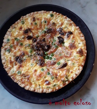 - ♦ Garnir les quiches avec petits pois, tomate, oignons et lardons, ciboulette et gruyère. Couler l’appareil à hauteur.