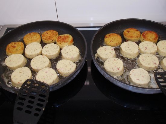 ◊ Petits pois et haricots verts liés au beurre, petites pommes Macaire (galettes de pulpe de pommes de terre assaisonnées et liées au beurre, dorées au beurre clarifié).