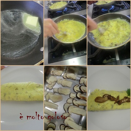 - ♦ Partager les cèpes hachés et sautés dans les oeufs. Faire sauter les 4 omelettes, les rouler.