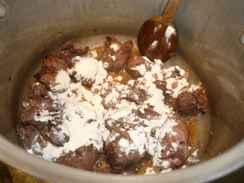 Singer : saupoudrer de farine les éléments d’une préparation à cuire » en sauce » (ragoût à brun) après les avoir fait revenir, et avant de les mouiller avec de l’eau, un fond, du vin, etc. Cette action a pour but de permettre la liaison du liquide de mouillement et de cuire les éléments dans un liquide lié.