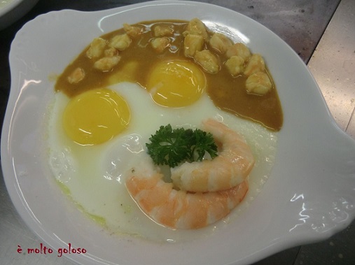 - – Dresser la bisque en assiettes creuses chaudes sur le salpicon de crevettes. Finir avec 1 crevette, des pluches de cerfeuil et les copeaux de parmesan.
