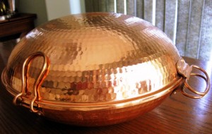 La Cataplana est une sorte de » poêle » en métal (cuivre, laiton, aluminium) formée de 2 parties concaves qui se referment l’une sur l’autre grâce à une articulation. La Cataplana possède des fermetures latérales.