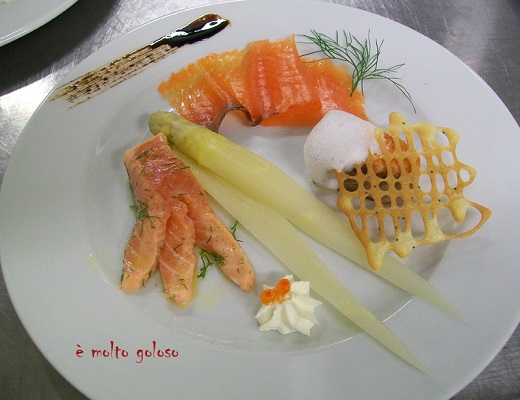 - • Dresser harmonieusement sur assiette froide (saumon fumé, saumon mariné, crème et œufs de saumon, asperge, cube de saumon chaud + quadrillage, finir avec une écume de citron [ mixer l’appareil citron et récupérer l’écume]).