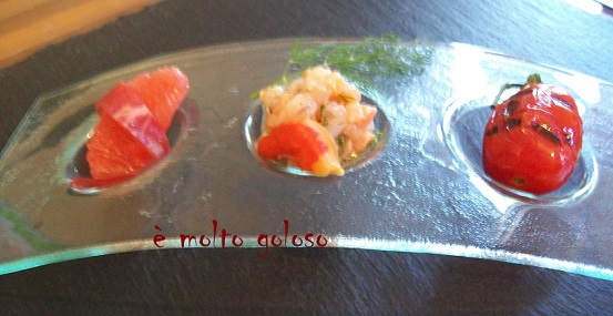 - * Dresser sur assiettes (photo sur assiette à trous). Tartare de saumon et Saint-Jacques au centre + aneth, Pamplemousse à l’italienne à gauche et tomate grillée chaude à droite.