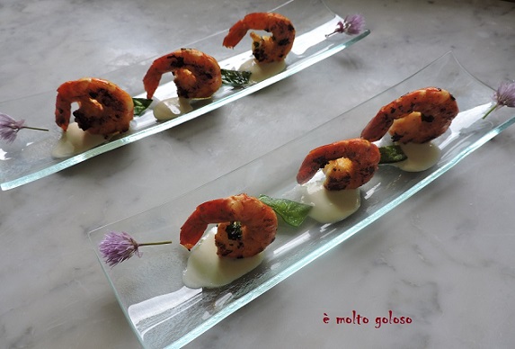 - ◊ Dresser sur assiettes chaudes longues : 3 gambas, sauce et pois gourmands. Finir fleurs de ciboulette.