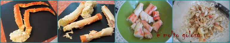 - ♦ Décortiquer 2 belles pattes de King Crab (crabe Royal de Norvège). Couper 12 tronçons et émietter le reste.