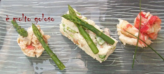 - ♦ Dresser sur assiettes froides rectangulaires : risotto moulé en « cercle » rectangulaire, 3 tronçons de King Crab, moulé les miettes en petit cercle. Finir avec pointes d’asperges lustrées à l’huile de pistache et tiges de ciboulette.