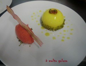 - ◊ Dresser sur assiettes froides : entremets + pistache caramélisée, points de coulis maracouja, quenelle de sorbet fraise/rhubarbe sur pistache concassée. Finir avec chips de rhubarbe.