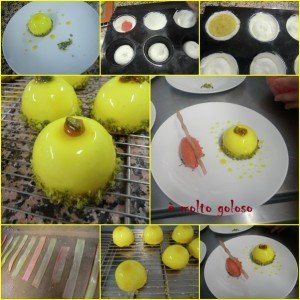 - ◊ Confectionner la mousse combava : cuire comme une crème anglaise 360 grammes de jus de citron vert, 15 grammes de zeste de combava, 145 grammes de jaunes d’œufs et 240 grammes de sucre semoule. Coller avec 20 grammes de gélatine poudre réhydratée avec 100 grammes d’eau. Refroidir. Incorporer 300 grammes de meringue italienne et 840 grammes de crème fouettée. Mouler en demi-sphères avec 1 insert de coulis fraise/rhubarbe. Fermer avec 1 biscuit cake citron. Réserver au grand froid.