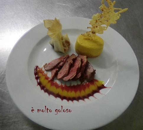 - ¤ Tailler les magrets en éventails. Disposer sur assiettes chaudes avec les 3 « coulis ». Finir aumônière, flan de carotte et tuiles.