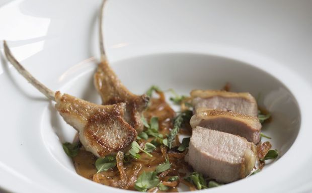 - ◊ Côtes d’agneau grillées, garnies de fonds d’artichaut emplis de purée de pointes d’asperge. Sauce bordelaise à la moelle.