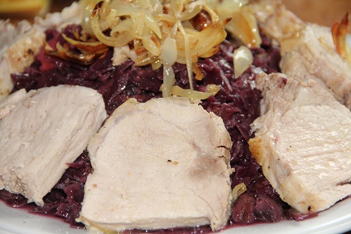 - ◊ Chou rouge en julienne à la graisse de porc et bouillon. Ajouter un filet de vinaigre et pincée de sucre. En fin de cuisson pomme fruit râpée ou en dés et marrons en brisures.