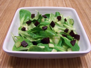 La salade Lorette associe la mâche, le céleri-rave en julienne et les betteraves cuites.