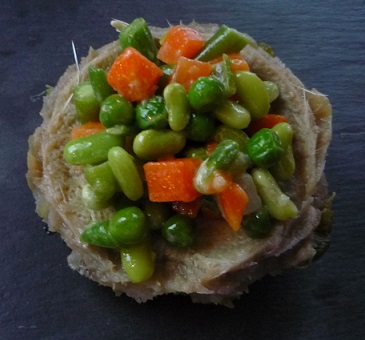 - ◊ Légumes taillés en cubes de 5 millimètres, pochés et liés au beurre (petits pois et haricots verts 35%, carottes, navets et flageolets 65%. Dressés en fonds d’artichauts.