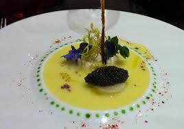 Plats : purée Joël Robuchon, gelée de caviar à la crème de chou-fleur, risotto de ris de veau aux truffes d’été et copeaux de parmesan