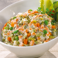 Macédoine : résultat du taillage régulier en petits dés (0,4 cm) de certains éléments (légumes, fruits). Appellation de préparations utilisant ces éléments ainsi taillés.
