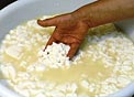 - ¤ Le caillé est coupé et mis à la louche (moulage manuel) dans les moules. Le caillé s’égoutte de 24 à 48 heures à + 20°C. Il est régulièrement retourné.