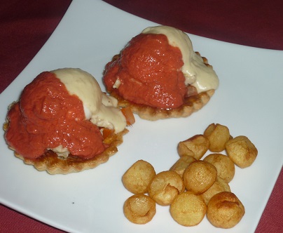 - ◊ Œufs par deux sur tartelettes garnies de salpicon de volaille au velouté. Un nappé de sauce allemande ou suprême et truffe hachée, l’autre nappé de sauce tomate et jaune d’œuf dur haché.