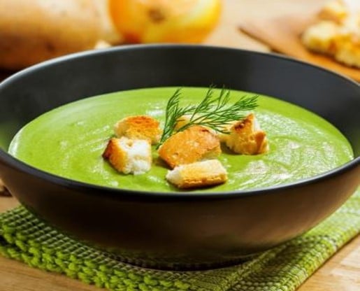 Potage Clamart : purée de petits pois au consommé. servir avec des croûtons frits.