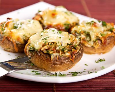 - ◊ Gros champignons grillés et garnis de purée de marrons, rognons de coq et petites truffes entières cuites au madère. Ou fonds d’artichaut garnis de purée de champignons et gratinés. Surmontés de rognons de coq et lames de truffe. Napper sauce de déglaçage au madère.