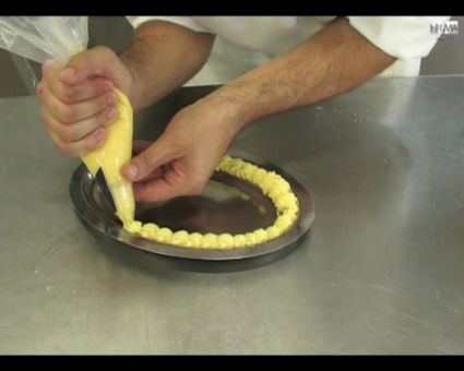 Festonner : garnir ou orner les bords d’un plat de service avec différents éléments décoratifs (gelée prise de forme variée, croûtons de pain de mie frit, agrumes historiés cannelés…) en les disposant en feston (guirlande).