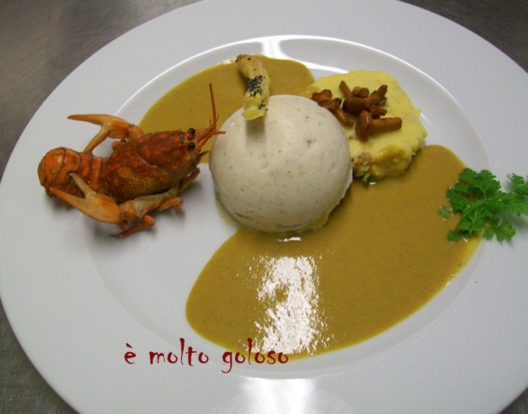 - • Dresser sur assiettes chaudes : 1 socle de polenta, poser 1 papeton, finir avec sauce, écrevisse troussée, fleuron, quelques petites girolles sautées et bouquet de cerfeuil.