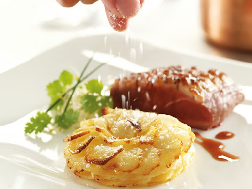 - ◊ Pièces sautées et dressées sur pommes Anna, saucées du déglaçage au porto et fond de veau tomaté. Garnir pointes d’asperge au beurre, œufs moulés en appareil à duchesse panés et frits et évidés et garnis de purée de foie gras.