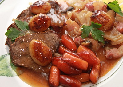 - ◊ Viande braisée : Carottes tournées et glacées, petits oignons glacés à brun, lardons.