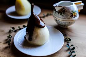 Poire Belle-Hélène : poire Williams pochée au sirop sur glace vanille. Napper de sauce chocolat chaude.